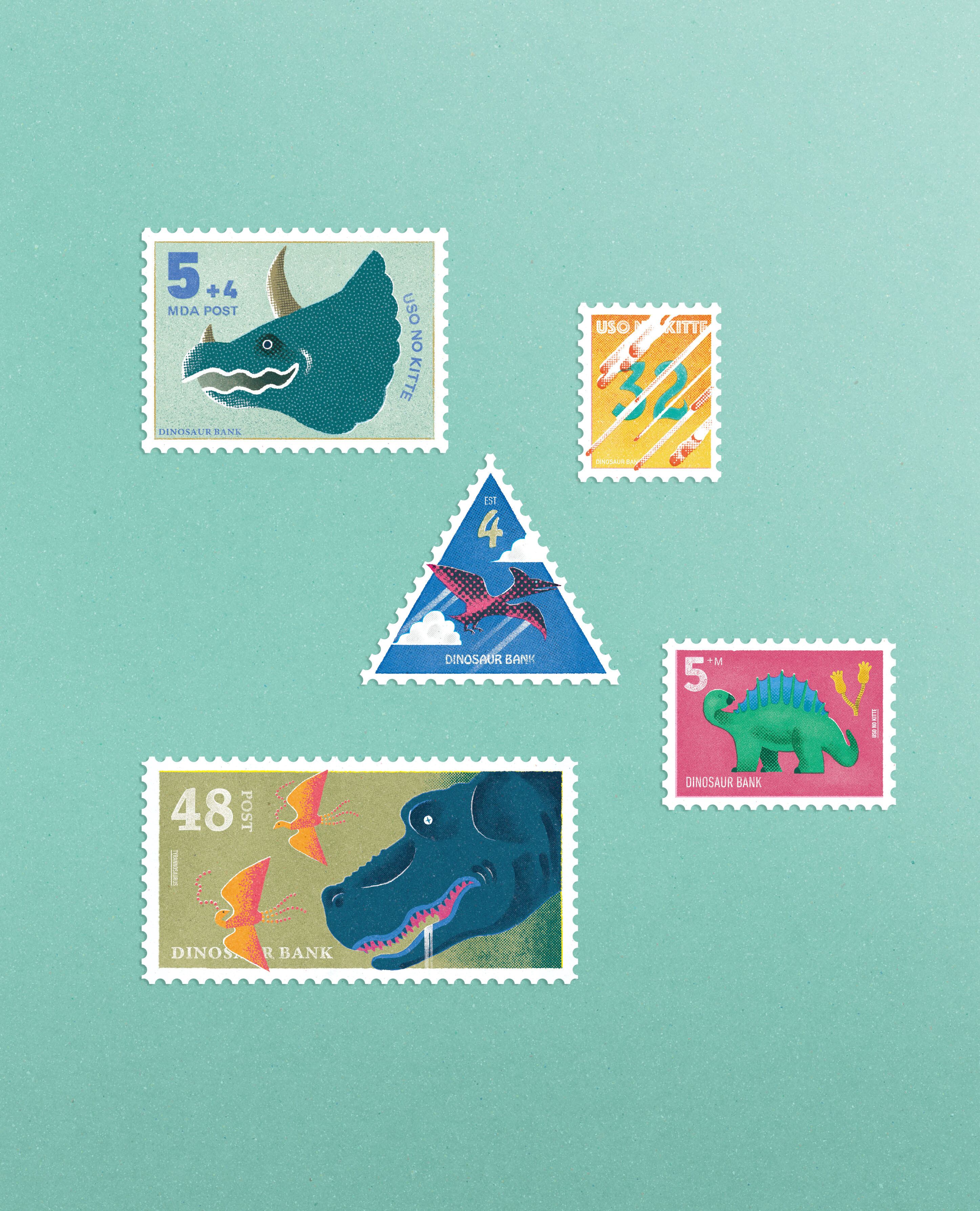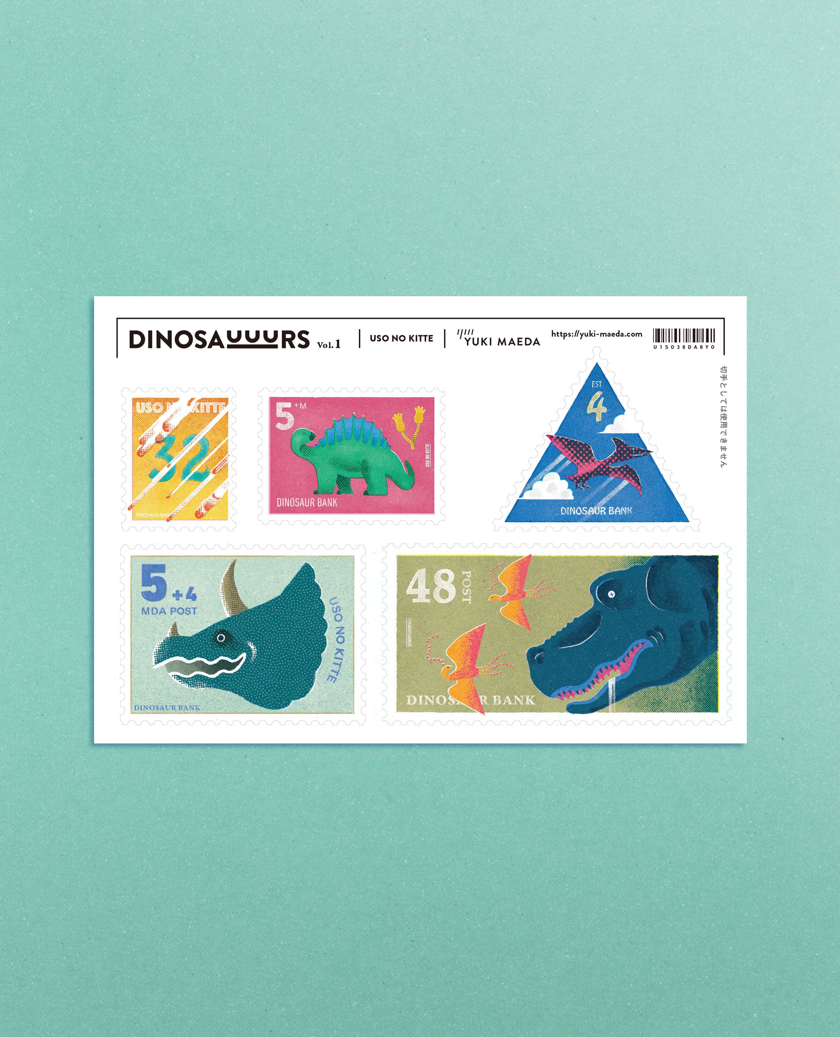 DINOSAUUURSシリーズの切手風のステッカー。