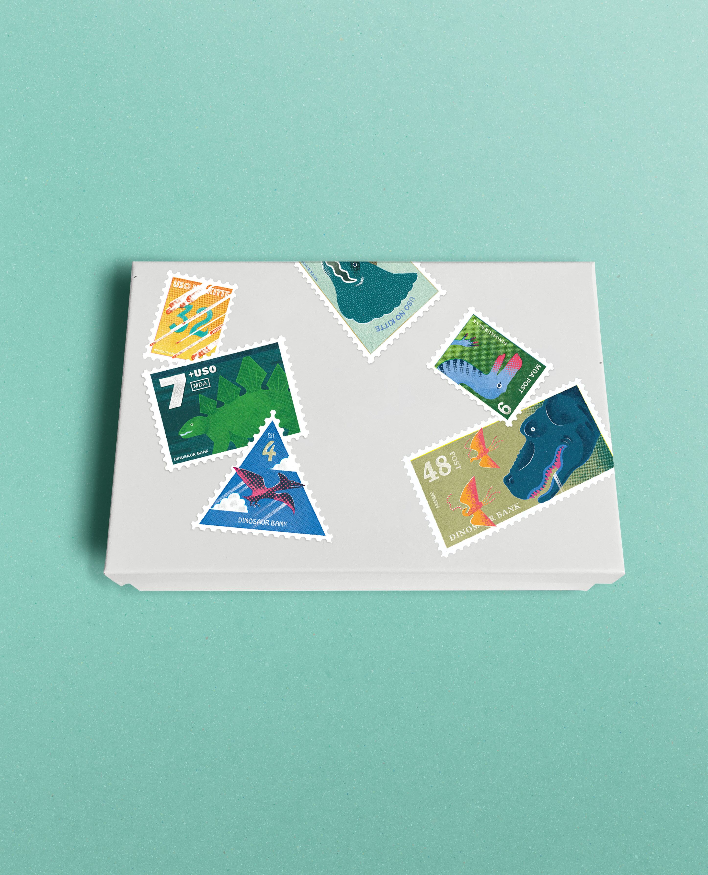 DINOSAUUURSシリーズの切手風のステッカー。